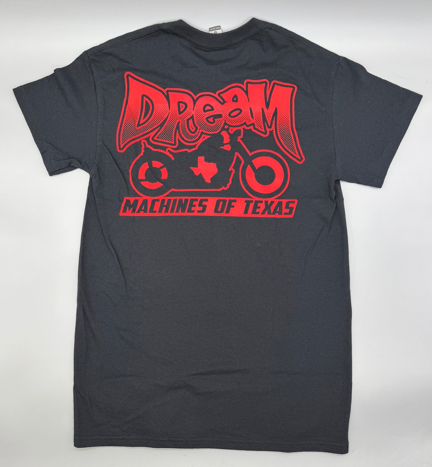 Black t-shirt with logo on the front left chest and large logo on the back.